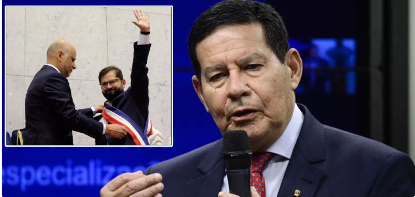 O vice-presidente da República, general Hamilton Mourão (Republicanos), foi praticamente enxotado da cerimônia de posse do presidente do Chile, Gabriel Boric, nesta sexta-feira (11). Após a cerimônia, realizada no Senado chileno, Mourão, representante do governo brasileiro na posse do esquerdista, parou em frente à sede ao congresso para conceder uma entrevista.